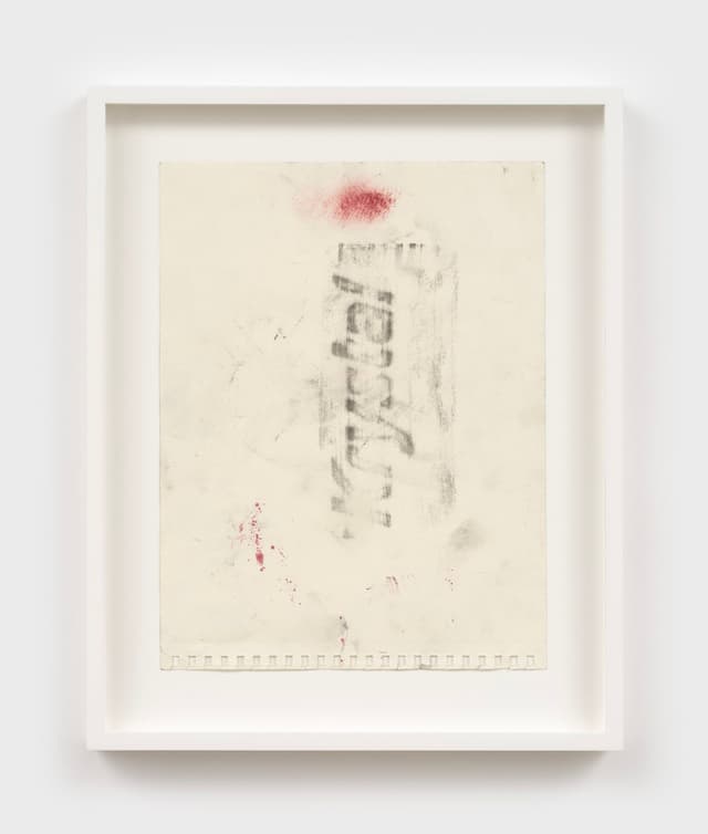 While all works revel in a space somewhere beyond legibility—wherein grayscales of scratches, smudges and swathes graph a gestural score atop various substrates—some slip into index. Two drawings are borne of a takeaway box from Krystal, a fast food restaurant near the artist’s house, that Costello employs as a positive for rubbings. Here the word Krystal repeats like a ringing bell. Another—a tri-fold from Dia Beacon—washes in a howl of soot sourced from train tracks, cat bites carving out names written for the program like Louise Bourgeois and John Chamberlain. The contextual collision speaks to their incompatibility, the work of making-do against that of making-monument.